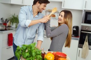 lachendes paar kämpft mit kochlöffeln in der küche